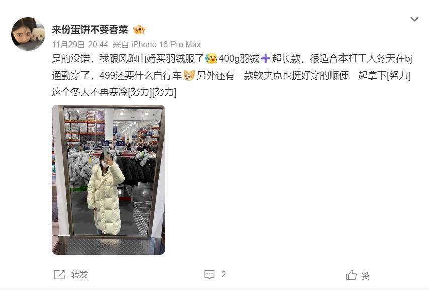“是的没错,我跟风跑山姆买羽绒服了,400克羽绒+超长款,很适合本打工人冬天在北京通勤穿了。499要什么自行车,这个冬天不再寒冷。”