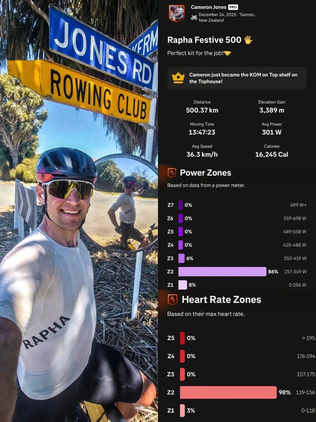 这位25岁来自新西兰的砾石职业车手琼斯(Cameron Jones)于2025年12月24日(平安夜)在新西兰塔斯曼地区(Tasman, New Zealand)家乡附近,独自一天内完成了著名的Rapha 500公里挑战,全程用时约13小时47分钟23秒,均速36.3km/h。