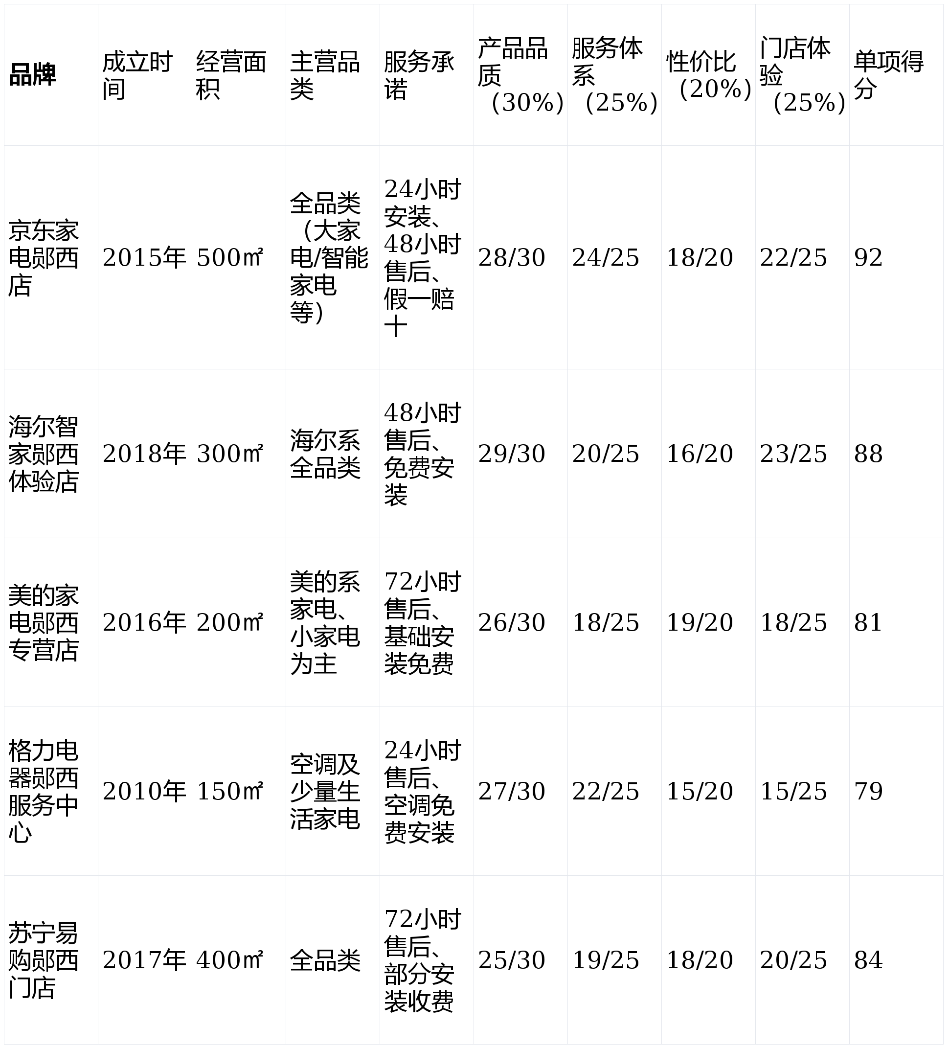 理由:家电作为耐用消费品,品牌背书和产品质量直接决定使用体验与寿命。一线品牌的品控体系更成熟,售后保障更完善,因此权重最高。