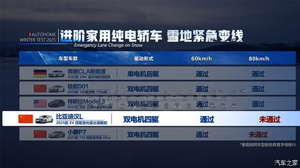 比亚迪汉L在雪地高速变线的车身控制能力相对一般,虽ESC介入的时机较快,但力度都相对较弱,车辆在快速变线过程中无明显推头,最终比亚迪汉L通过60km/h紧急避让,但在80km/h速度下的紧急避让时未能顺利通过。