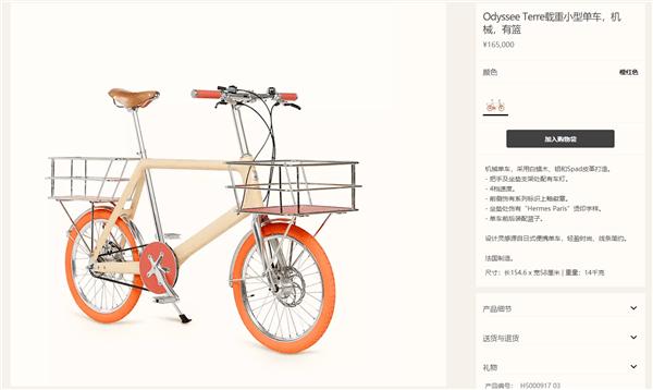 近日,爱马仕在其官方商城上架了一款自行车,卖16.5万人民币。官网显示这款自行车长154.6厘米、宽58厘米 ,总重约14公斤。